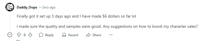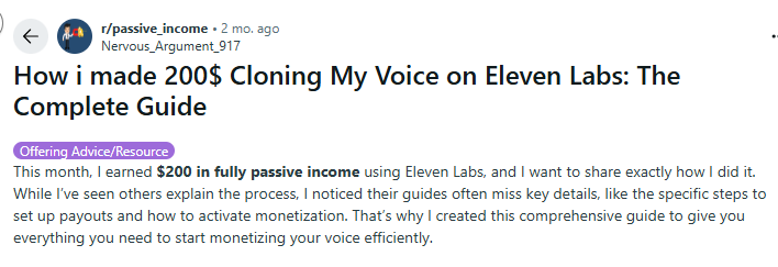 This Reddit user made $200 by cloning their voice in Elevenlabs. They didn’t indicate how long it took to make their first sale but in the current month of making the post, he had already made $200.